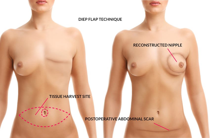 - Procedur med vävnadsklaff (autolog): Vid denna teknik för bröstrekonstruktion använder kirurgen patientens egen vävnad för att skapa en höft som tas antingen från buken, låren, ryggen eller skinkorna för att rekonstruera brösten.